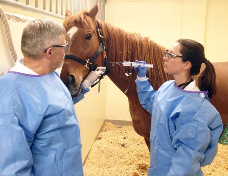 Dr. Spencer Barber (left) and graduate student Dr. Suzanne Mund administer stem cells intravenously to one of the horses involved in their wound healing study. Photo courtesy of WCVM